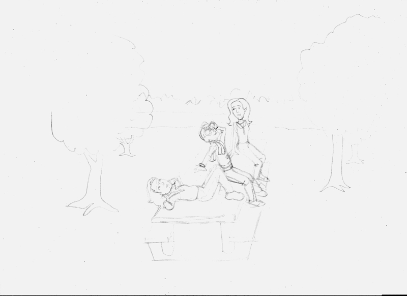 You might notice there are some significant differences between the preliminary sketches and the final one. I relocated the trees on the right, and Sandy's feet are closer to her body. You notice things at each stage you want to fix. (Actually, I just noticed the arm Dan is leaning on should be longer. Oh, well, too late to change that now.)
