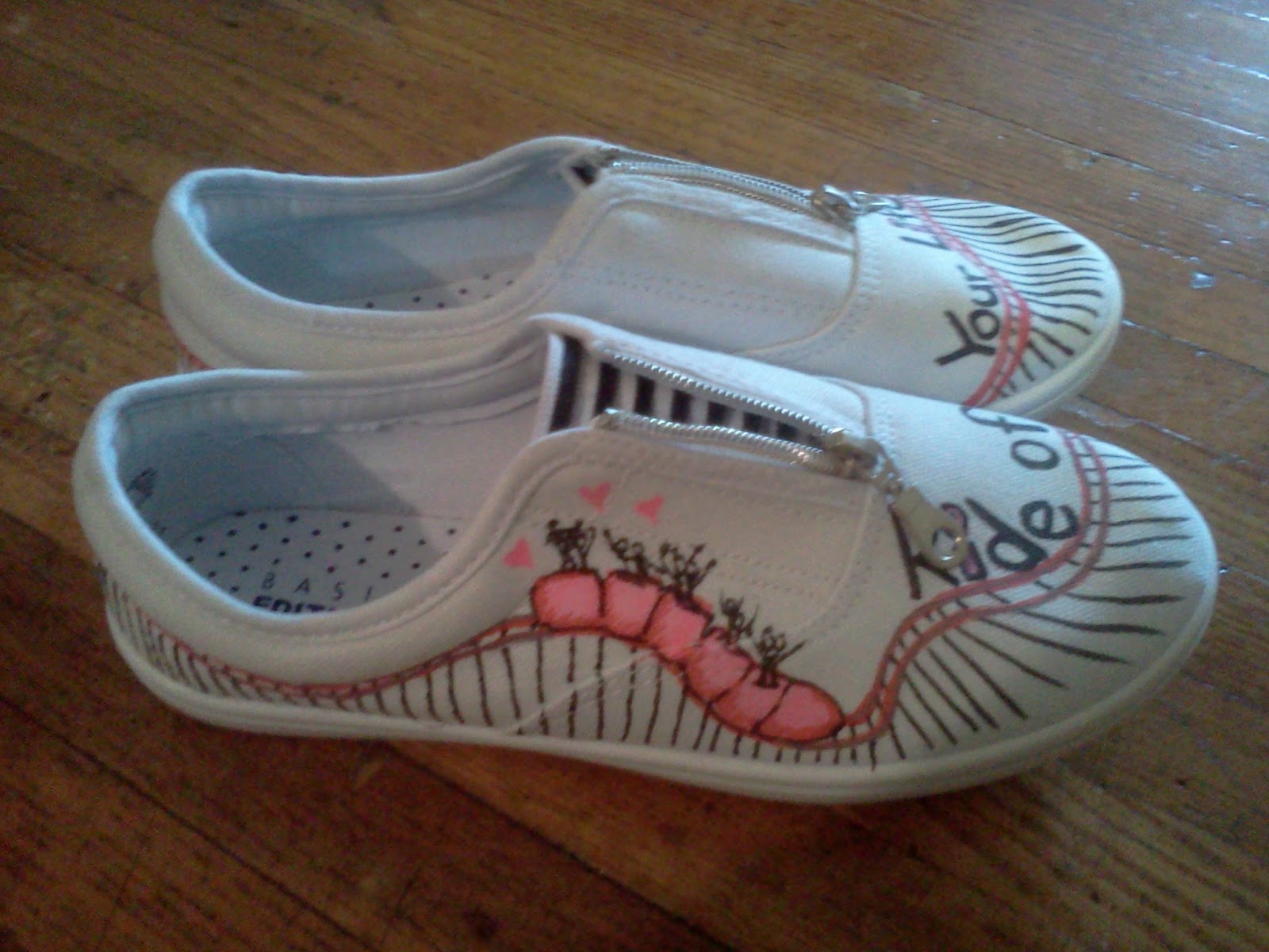 What do you think of my new sneakers? I bought a cheap pair from Kmart and a bunch of Stained by Sharpie markers. I didn't know what I'd draw at first, but some friends suggested something from one of my books, so I went with a romantic amusement-park theme for Ride of Your Life.